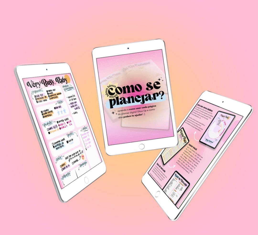 - garanta seu Planner Digital Glow Up HOJE e receba gratuitamente o ebook “Como se planejar? - Aprenda a importância de um bom planejamento, aprenda a como usar cada uma das páginas do planner Digital Glow Up e como elas podem te ajudar! :)”